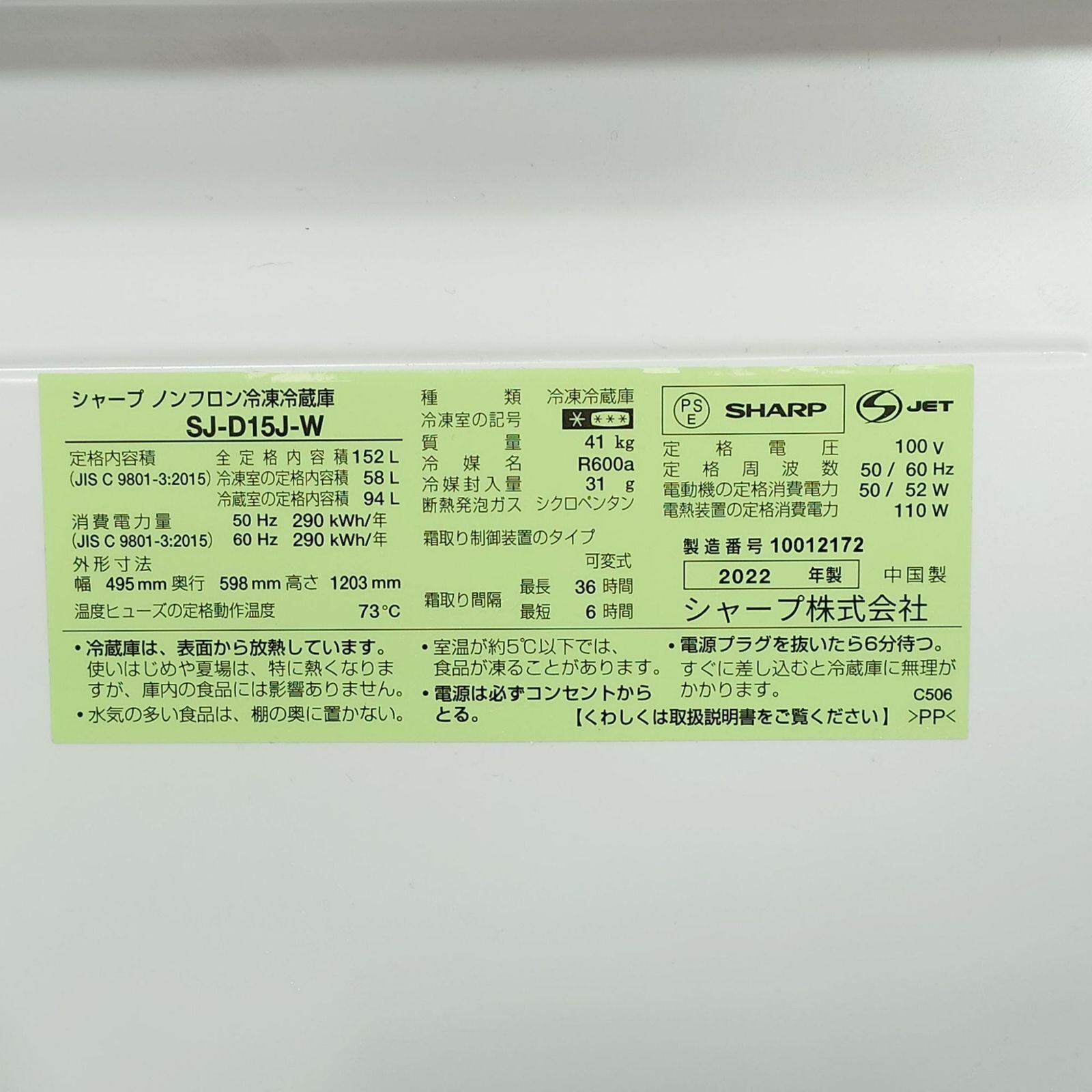 D 26175【2022年製】美品 SHARP シャープ SJ-D15J-W ノンフロン冷凍冷蔵庫 152L どっちもドア