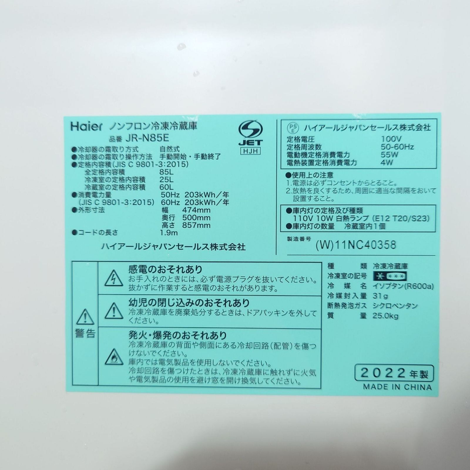 D 26186【2022年製】Haier ハイアール JR-N85E ノンフロン冷凍冷蔵庫 85L