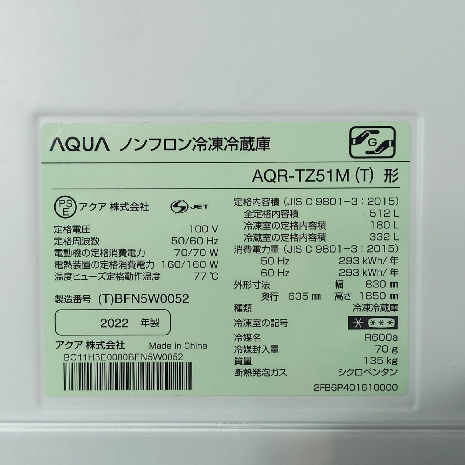 D 26197【2022年製】 美品 家電 AQUA アクア 冷凍冷蔵庫 AQR-TZ51M 512L
