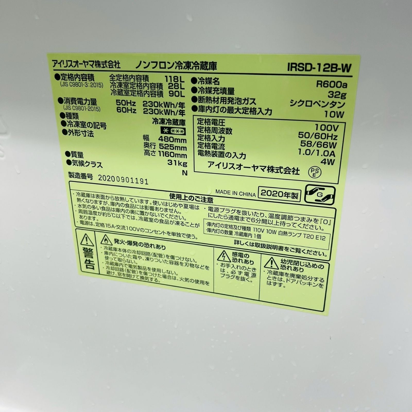 D 26222【2020年製】 IRIS OHYAMA アイリスオーヤマ IRSD-12B-W 冷凍冷蔵庫