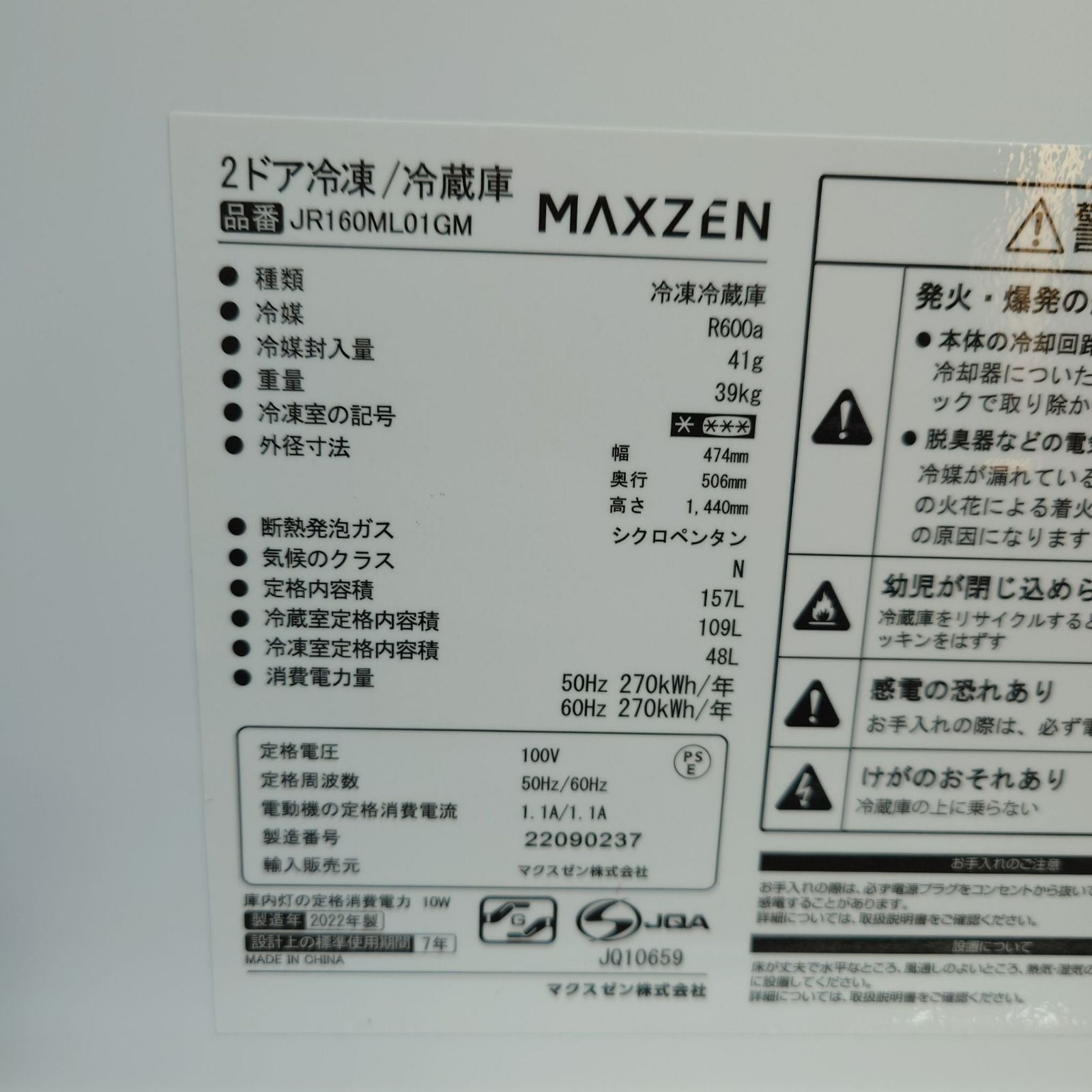D 26228【2022年製】冷蔵庫 MAXZEN マクスゼン JR160ML01GM 157L