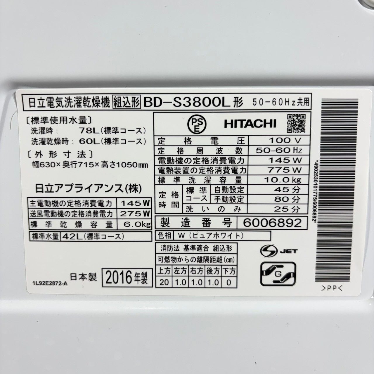 D 26239【2016年製】 HITACHI 日立 格安ドラム式洗濯機 BD-S3800L 10/6kg
