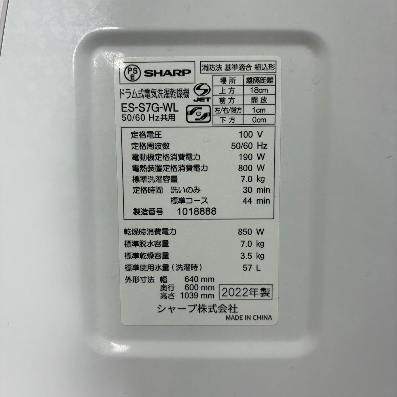 D 26240【2022年製】美品 SHARP シャープ ES-S7G-WL ドラム式電気洗濯乾燥機 7.0kg 乾燥3.5kg