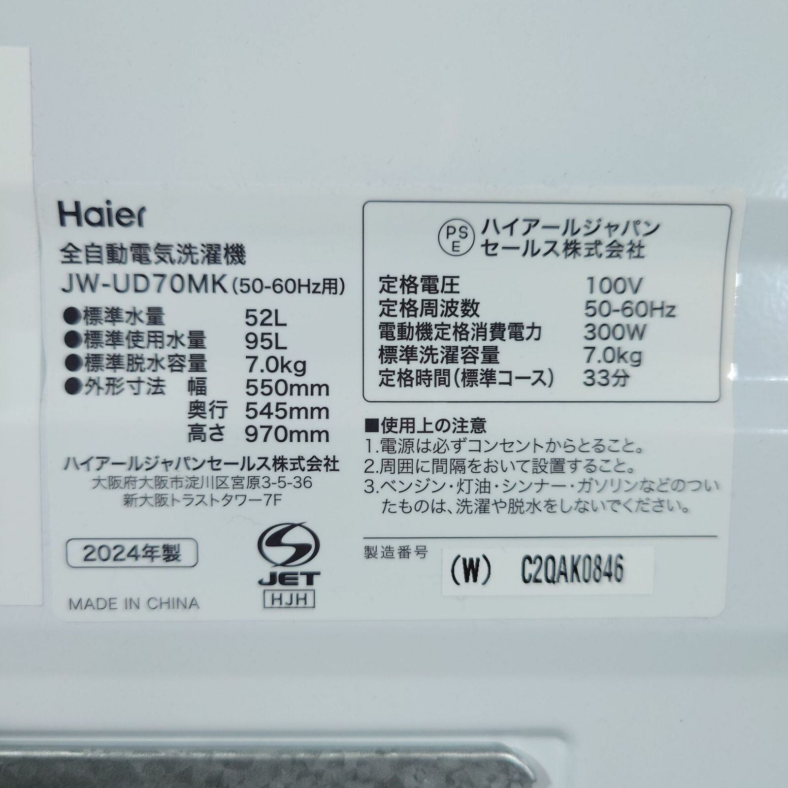 D 26265【2024年製】 極美品 家電 Haier ハイアール 洗濯機 JW-UD70MK 7.0㎏